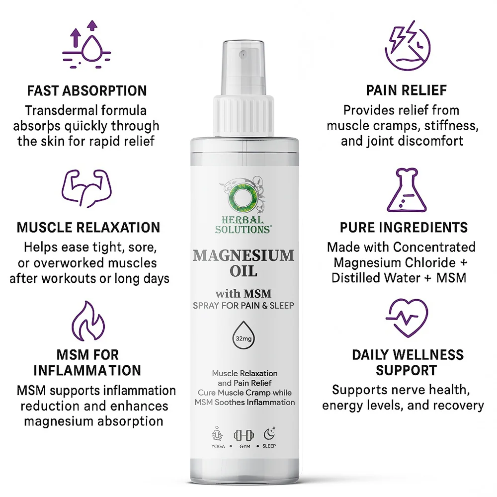 Regular use of Magnesium Oil with MSM helps ease muscle tension, stiffness, and occasional cramps, making it ideal for people with active lifestyles, long working hours, or physical fatigue. Magnesium plays a vital role in muscle and nerve function, while MSM provides organic sulfur that supports joint flexibility, tissue repair, and overall mobility.